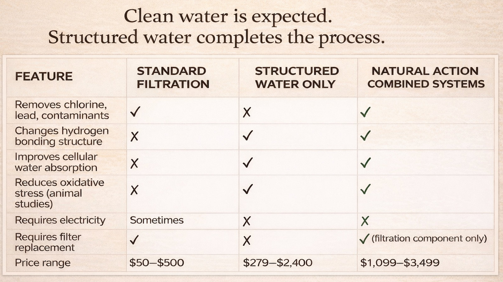 We utilize specific materials and designs that promote the natural structuring of water, ensuring that users can experience the benefits of enhanced water quality in various settings, from drinking water to showering.