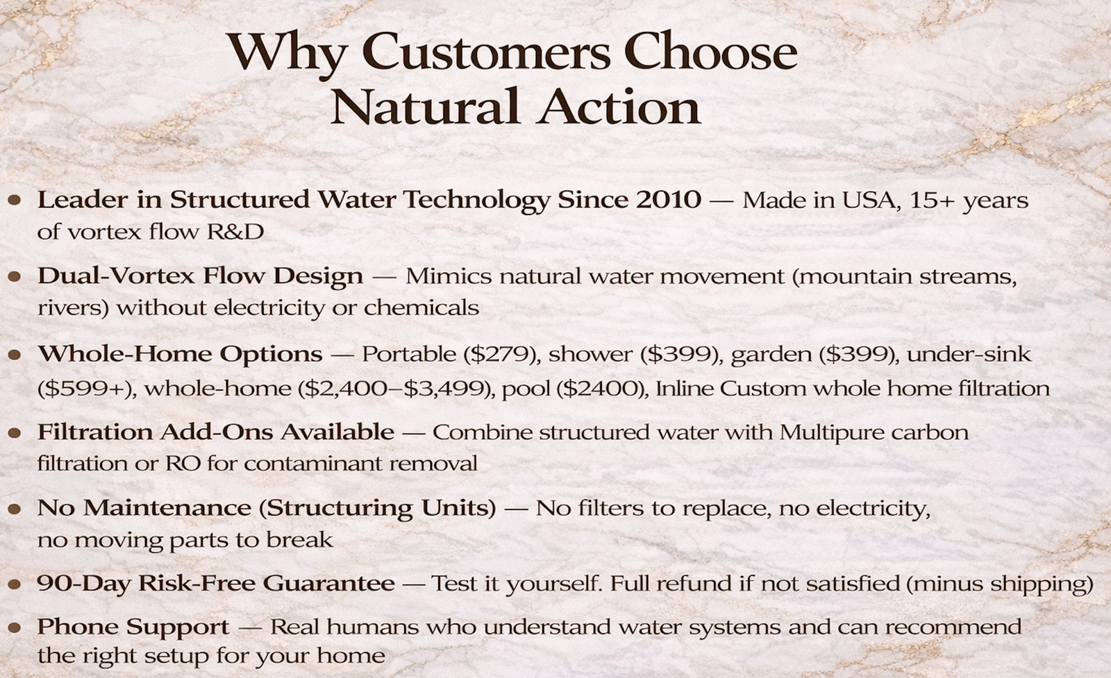 Natural ionization provides water vitality and revitalized structured water the way Nature intended. All our products are made in the USA. Learn more about the process and verification HERE