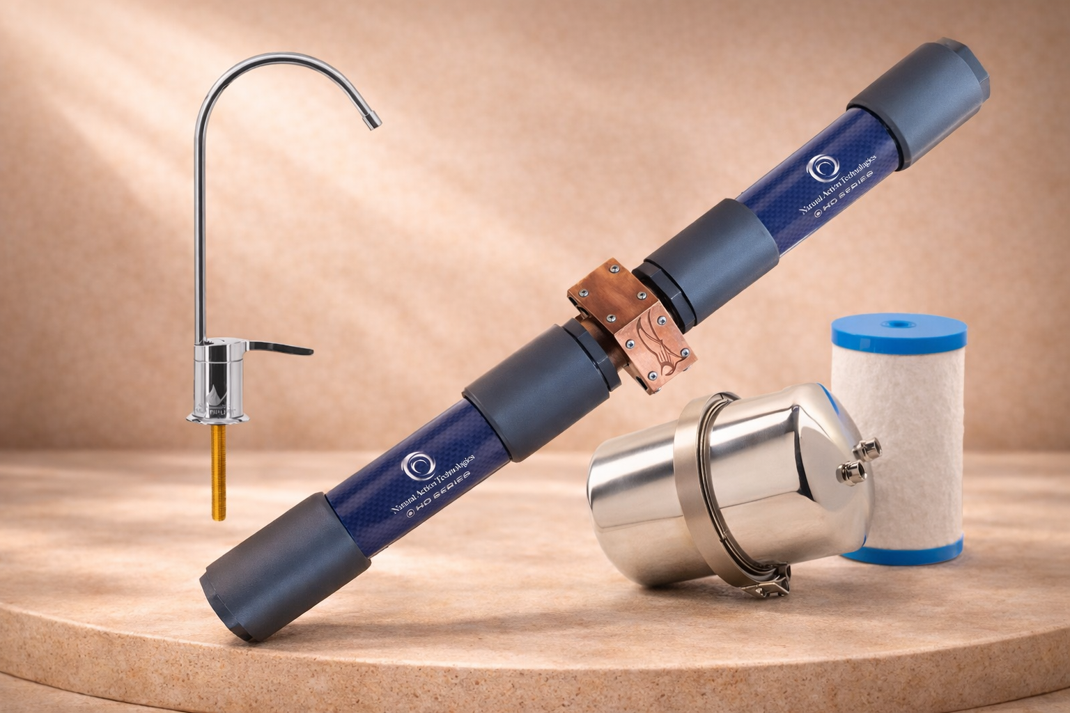 Installed at the main water line, MagnaRay works passively structuring water—supporting the water experience at every tap without electricity, moving parts, or ongoing maintenance.